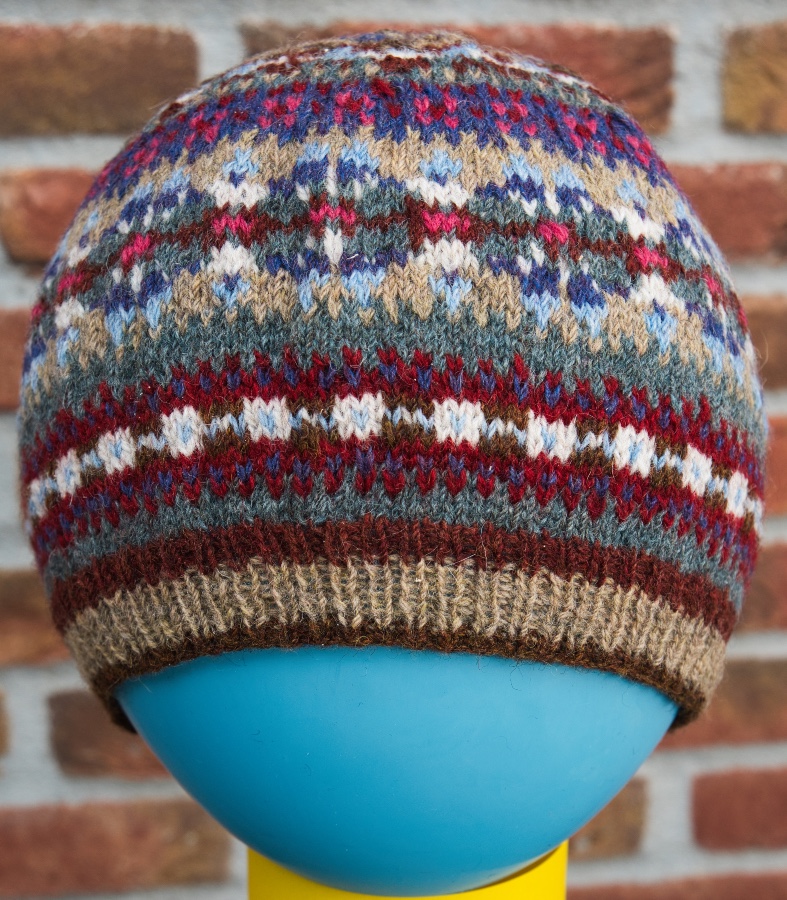 Op de fair Wollig Landleven kwam ik aan de praat met de mensen van het Breipunt. In hun kraam zag ik een leuk mutsje in Fair Isle-patroon. Met een pakketje garen en het patroon heb ik zo’n mutsje gemaakt (zie onder). Zo’n muts wilde mijn zus ook wel. Bij Wolwinkel Atelier Ann 52 in Nijeveen kocht ik een tas vol mooie kleuren garen van Jamieson's spindrift. Het resultaat zie je hierboven.